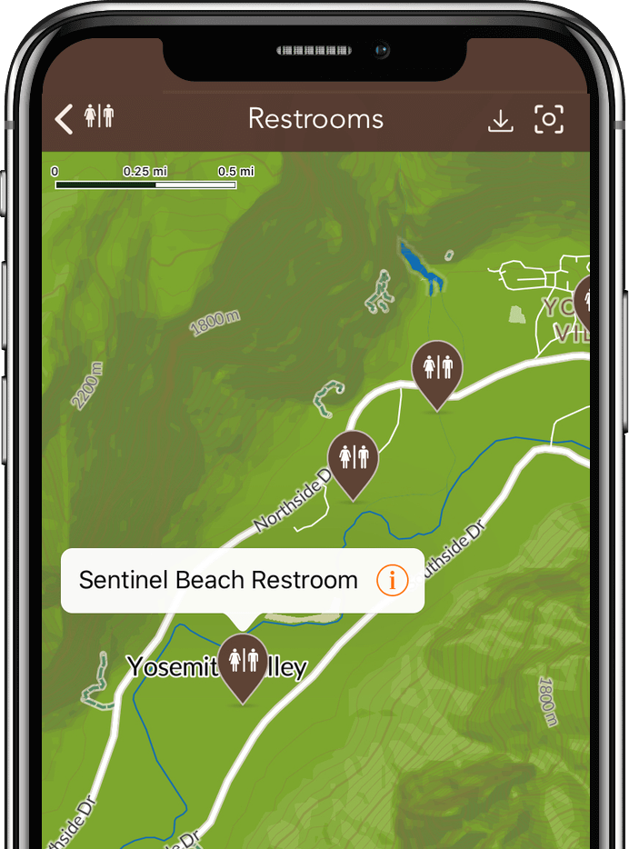 No need to wait in line to ask a ranger - know exactly where the closest restroom is at all times. Easily located parking lots, gas stations, campgrounds, and gift stores.